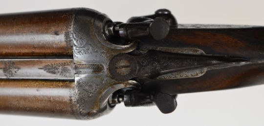 Cogswell & Harrison 12 bore side by side hammer action shotgun with named and engraved locks, engraved hammers, trigger guard, top plate, thumb lever and fences, chequered grip and forend, double trigger and named 30 inch Damascus barrels choked ½ and cylinder, overall length 118cm, length of pull 36cm, serial number 16173. PLEASE NOTE THAT A VALID RELEVANT FIREARMS/SHOTGUN CERTIFICATE IS REQUIRED TO HANDLE/PURCHASE THIS ITEM.