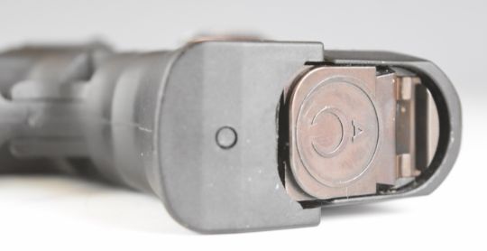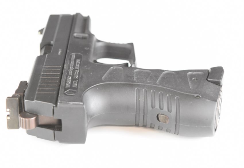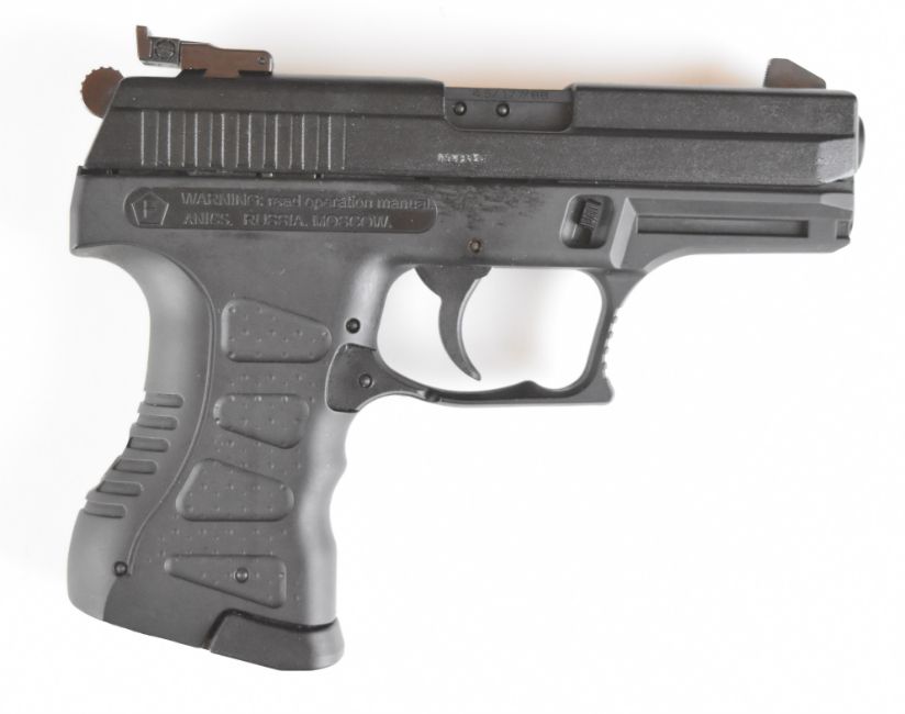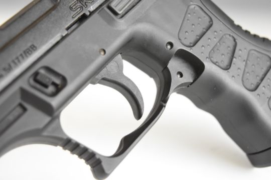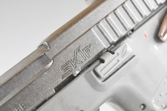 Skif A-3000 .177 COair pistol with two 28 shot magazines, textured composite grip and adjustable sights, serial number 0003335, in wooden box with instructions.