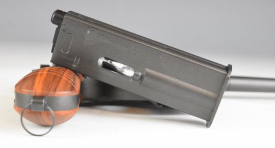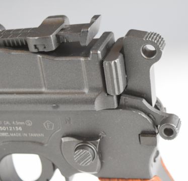 KWC Broomhandle Mauser M712 .177 blowback air pistol with faux wooden grips, serial number 45012156, in original box with accessories.