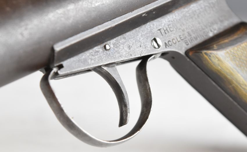 Accles & Shelvoke Ltd F Clarke patent The Warrior .177 side lever air pistol with logo and chequering to the Bakelite grips and adjustable sights, serial number 1731.