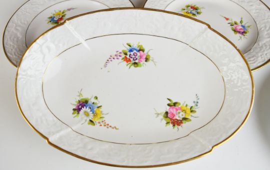 Spode dessert ware comprising two dishes and six plates with relief moulded dolphin borders and hand decorated with flowers, largest 27cm