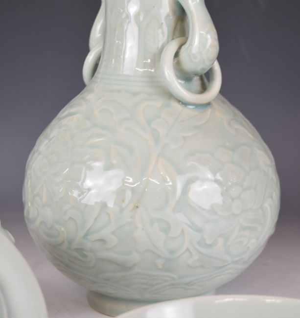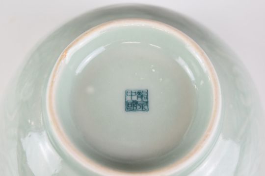 Chinese celadon glazed vase, height 32cm, and matching covered pot and bowl, all with four character marks to base