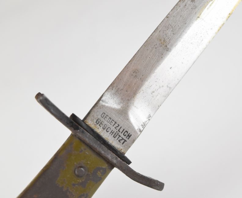 German WW1 crank handled trench knife bayonet with Demag Duisberg and Gesetzlich Geschutzt to ricasso, remnants of green paint to handle, 14cm double edged blade and metal scabbard. PLEASE NOTE ALL BLADED ITEMS ARE SUBJECT TO OVER 18 CHECK ON COLLECTION OR DELIVERY