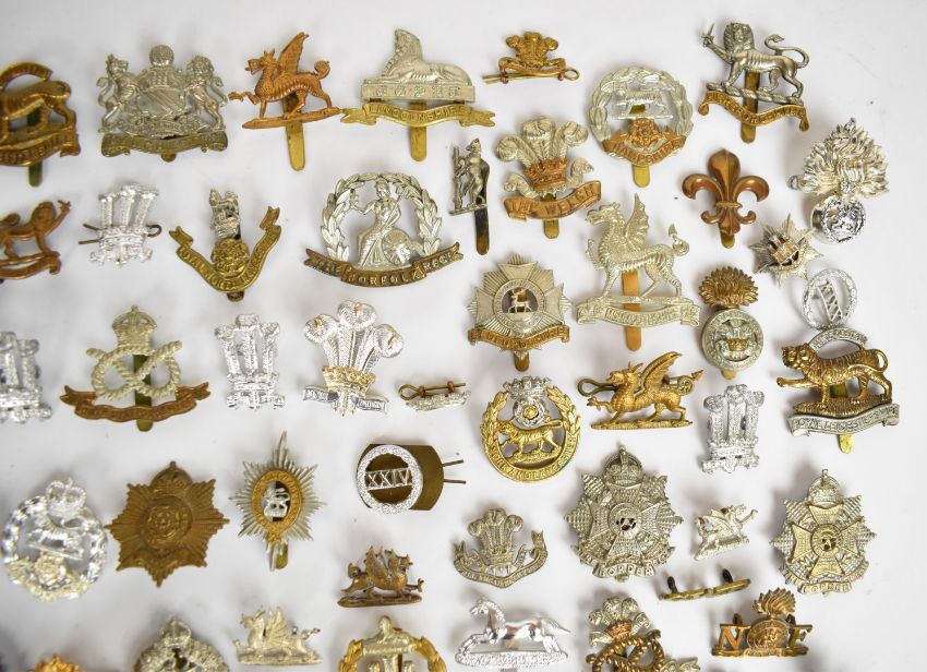 Large collection of approximately 100 British Army cap badges including Middlesex Regiment, Dorsetshire Regiment, Northamptonshire Regiment, North Staffs Regiment, Royal Welsh Fusiliers, Hampshire Regiment, Border Regiment, Gloucestershire Regiment, Royal Sussex Regiment, Yorkshire Regiment, Royal Leicestershire Regiment, Norfolk Regiment, Army Air Corps and Lancashire Fusiliers, etc, some restrikes