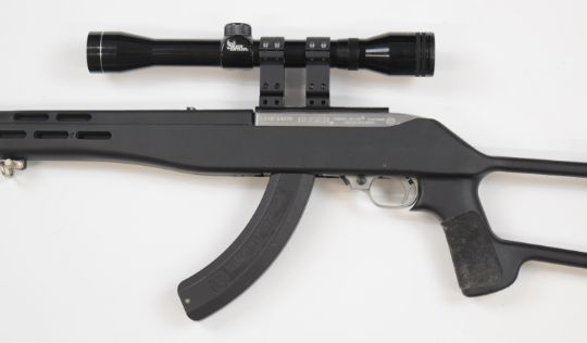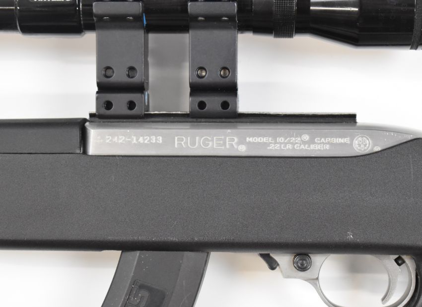 Ruger Model 10/22 .22 semi-automatic rifle with composite skeleton stock, extended magazine, Tasco 4x32 scope and 18.5 inch barrel, overall length 93cm, serial number 242-14233. PLEASE NOTE THAT A VALID RELEVANT FIREARMS/SHOTGUN CERTIFICATE IS REQUIRED TO HANDLE/PURCHASE THIS ITEM.