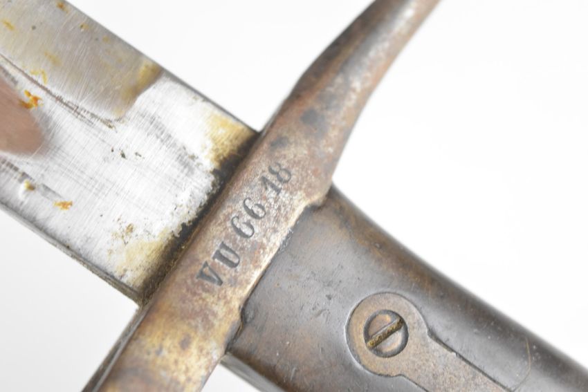 Italian 1870 pattern Vetterli bayonet with downswept quillon, external leaf spring, VU 66 18 to crossguard and 52cm fullered blade, with scabbard in three pieces. PLEASE NOTE ALL BLADED ITEMS ARE SUBJECT TO OVER 18 CHECK ON COLLECTION OR DELIVERY
