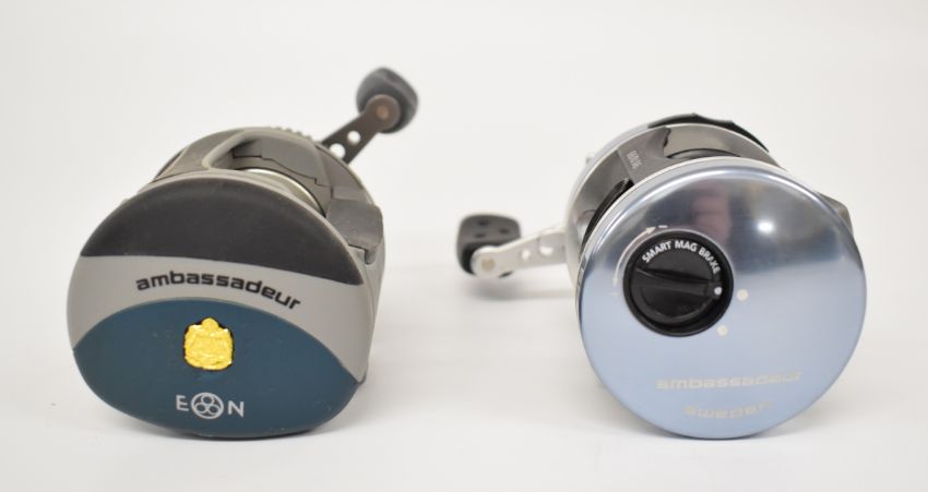 Four Abu Ambassadeur multiplier fishing reels comprising 6600D5 SW Premium Mag-Elite, 6600CL, 6600D6 and E6600, all boxed, some with accessories and paperwork, three appear new / unused