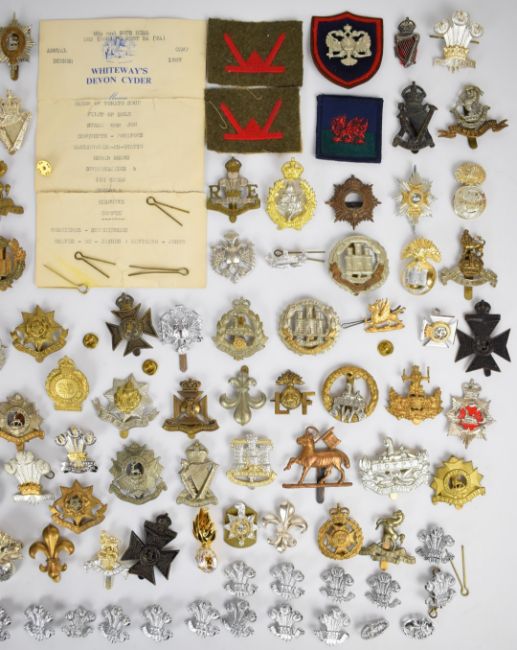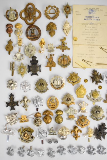 Large collection of approximately 100 British Army cap badges including Royal West Kent Regiment, The Essex Regiment, Norfolk Regiment, East Lancashire Regiment, Cheshire Regiment, Wiltshire Regiment, Kings Royal Rifle Corps, York and Lancs Regiment, Gloucestershire Regiment and Royal Monmouthshire Royal Engineers with a dinner menu from the W/Os and Sgts Mess, 283 Monmouthshire Artillery, etc, some restrikes