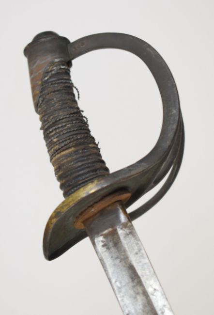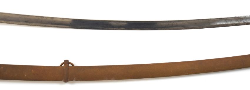 American Civil War 1860 pattern sword stamped 100 to pommel, with three bar hilt, leather and wire grip, 89cm curved blade and scabbard. PLEASE NOTE ALL BLADED ITEMS ARE SUBJECT TO OVER 18 CHECK ON COLLECTION OR DELIVERY