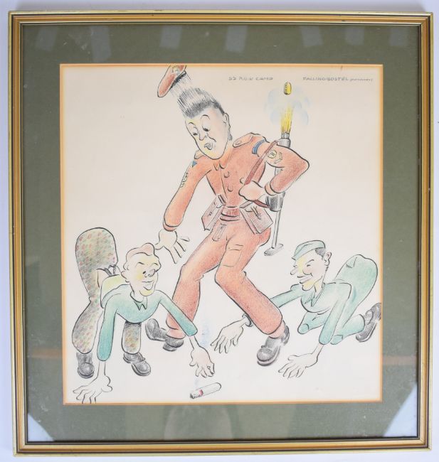 WW2 prisoner of war camp interest humorous pen ink and coloured pencil or similar cartoon, depicting a guard having accidentally discharged his gun with two prisoners on the floor near the butt of a cigarette, titled 'SS POW camp Fallingbostel' (Germany), 32 x 30.5cm