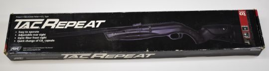 ASG TAC Repeat .177 COair rifle with textured semi-pistol grip and forend, raised cheek piece to the composite skeleton stock, 12-shot magazine, adjustable sights and scope rail, serial number 18A41165, in original box with instructions.