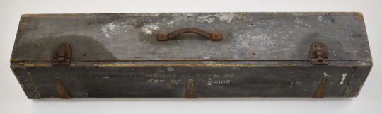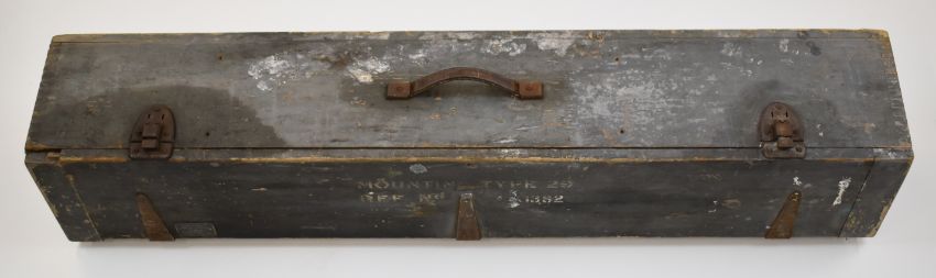 Military Air Ministry wooden storage case marked 'Mounting Type 29 Ref No /13S2' and with maker's plaque 'Case Storage Ref. No/ 14A/1383 AM Williamson Mfg Co Ltd London & Reading', 105 x 21 x 19cm