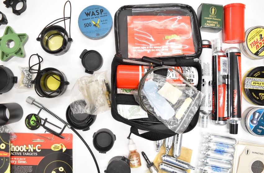 A collection of air rifle, pistol and gun parts and accessories including cleaning kits, pellets, targets, scope mounts, COcapsules, filling accessories etc