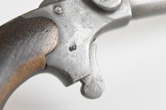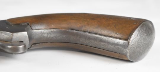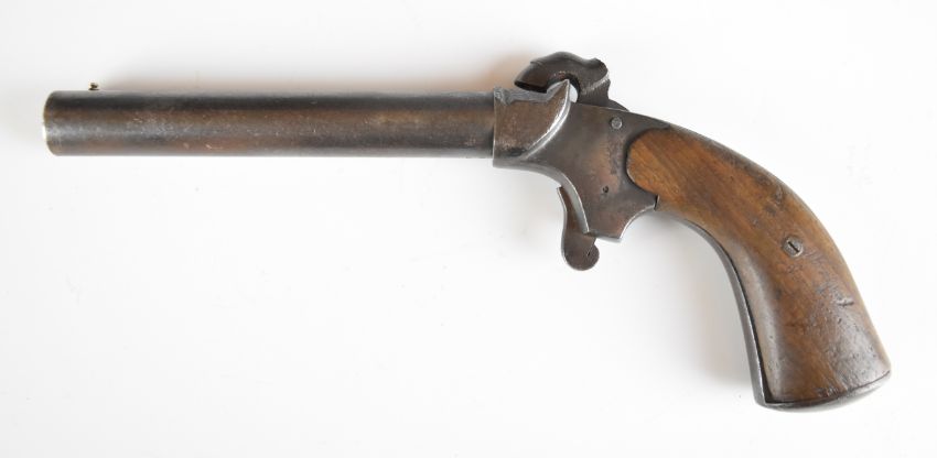 Unnamed 20 bore percussion hammer action bootleg 'man stopper' pistol with wooden grips and 6 inch smooth-bored barrel, overall length 28.5cm.
