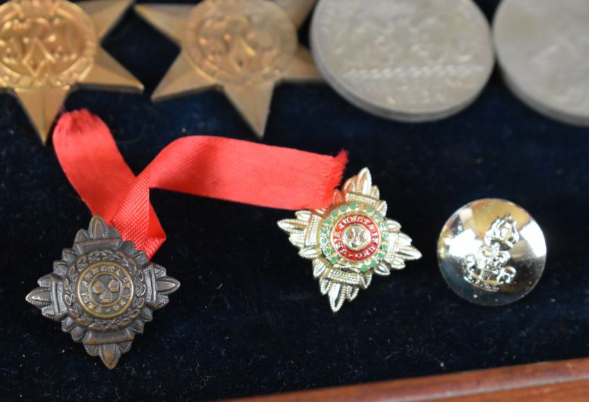 British WW1 and WW2 father and son medal groups comprising 1914/1915 Star, War Medal and Victory Medal named to 26381 Driver A Bridgland, Army Service Corps and 1939/1945 Star, Africa Star, Italy Star, Defence Medal and War Medal, together with a pair of Royal Army Educational Corps collar badges, etc