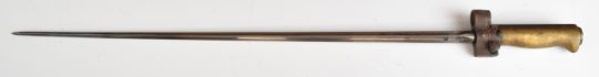 French 1886 pattern bayonet with brass grip, button catch, 42cm cruciform blade, scabbard and later leather belt loop. PLEASE NOTE ALL BLADED ITEMS ARE SUBJECT TO OVER 18 CHECK ON COLLECTION OR DELIVERY