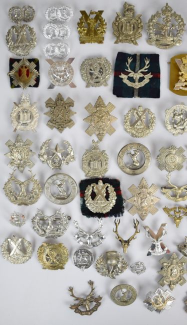 Collection of approximately 60 British Army Scottish Regiment badges including Royal Scots Guards, Royal Scots Fusiliers, Black Watch, Kings Own Scottish Borderers, Liverpool Scottish, London Scottish, Royal Scots, Glasgow Highlanders and the Lorne Scots, etc, some restrikes