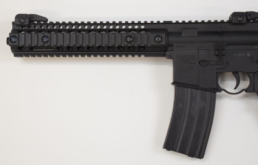 Crosman SBR .177 COassault style air rifle with textured pistol grip, tactical stock, multi-shot magazine and adjustable sights, serial number 18L22245, in original box with instructions.