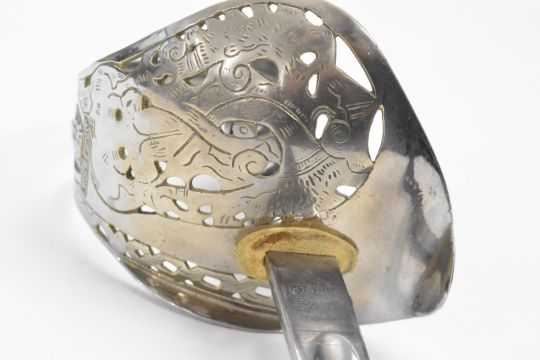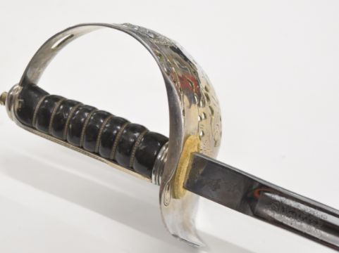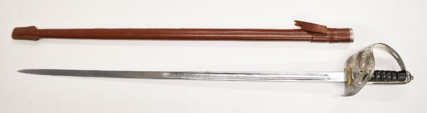 British Army 1897 pattern sword for the Indian Army by Rampla & Co, North Delhi with Indian Army Corps of Signals cypher to ricasso, 81cm etched blade, India State emblem to guard and leather covered scabbard. PLEASE NOTE ALL BLADED ITEMS ARE SUBJECT TO OVER 18 CHECK ON COLLECTION OR DELIVERY
