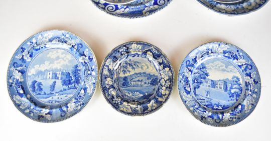 Collection of 19thC blue and white transfer printed ware, named scenes include Lambton Hall Durham, Glasgow Cathedral, Christchurch Oxford, Kirkham Priory, Fulham Church, Power Mill Hastings, St Vincents Rocks, a Masonic example, etc