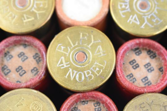 Twenty-five 4 bore Eley shotgun cartridges, in original box. We are not able to offer our usual postage service for this lot