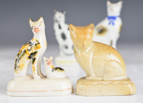19thC miniature Staffordshire and salt glazed stoneware cat and dog figures including a cat with kitten, legs separate, most spongeware decorated