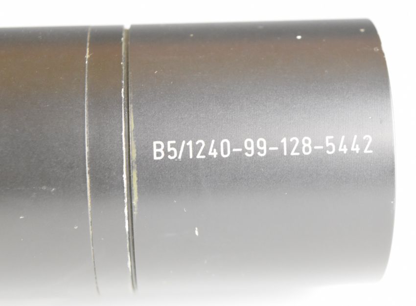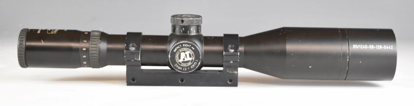 Schmidt & Bender PMII 3-12x50 telescopic rife scope with P4FL hunting recticle, mounted on scope rail, serial number B5/1240-99-911-6011.