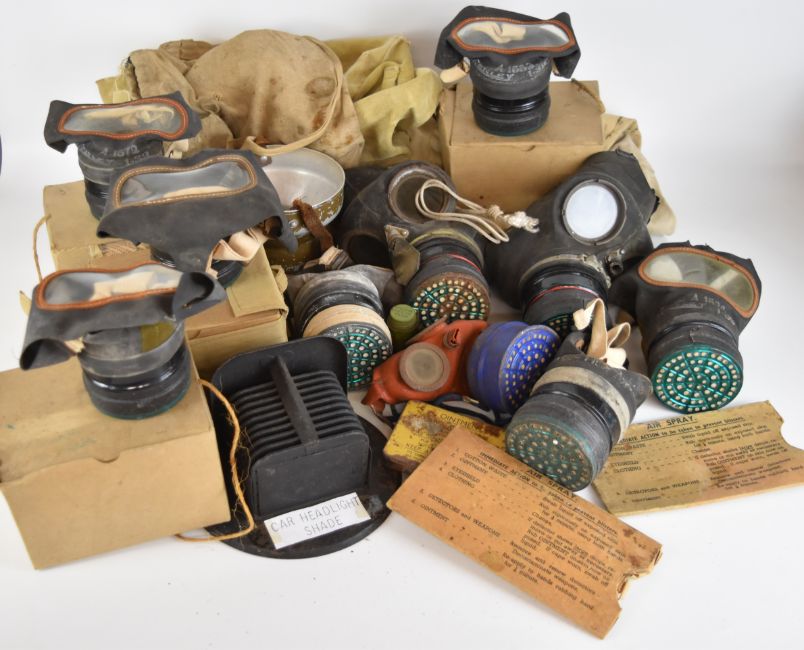 Ten various British WW2 gas masks / respirators including a child's example with metal storage tin and four in cardboard boxes, together with a kit bag and haversack, car headlight cover etc
