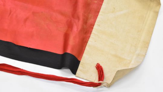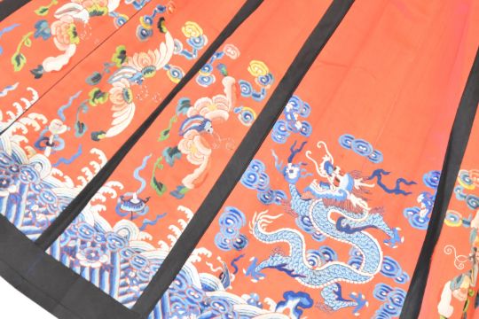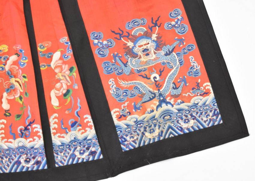 Chinese late Qing dynasty red silk pleated skirt embroidered with clouds, sea, birds and auspicious symbols and two dragon panels, length 120cm