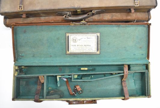 Three vintage leather and canvas bound shotgun carry cases, one with 'Army & Navy Co-operative Society Ltd 105 Victoria Street Westminster SW' label, largest 84 x 23 x 8.5cm.