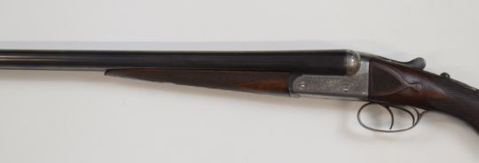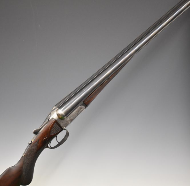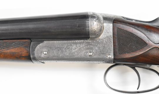 George Edward Lewis & Sons 12 bore side by side ejector shotgun with named and engraved locks, engraved underside, trigger guard, top plate, thumb lever and fences, chequered semi-pistol grip and forend, carved teardrop to the wrist, vacant cartouche to the underside of the stock, double trigger and named 28 inch barrels choked ¼, overall length 113cm, length of pull 36.5cm, serial number 12832. PLEASE NOTE THAT A VALID RELEVANT FIREARMS/SHOTGUN CERTIFICATE IS REQUIRED TO HANDLE/PURCHASE THIS ITEM.