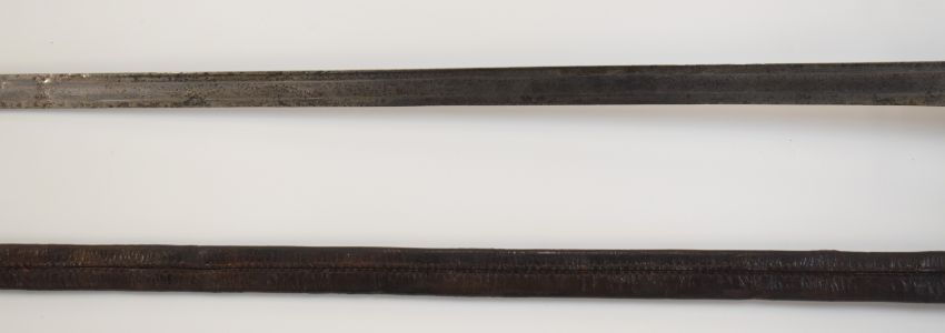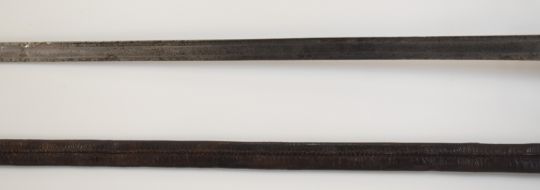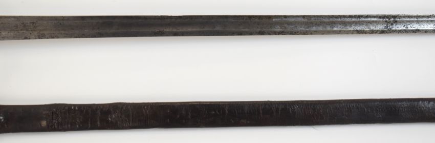 British Army Heavy Cavalry 1788 pattern Trooper's sword with three bar hilt, 92cm straight single edged blade stamped with a crown over 4 to ricasso and leather scabbard. PLEASE NOTE ALL BLADED ITEMS ARE SUBJECT TO OVER 18 CHECK ON COLLECTION OR DELIVERY