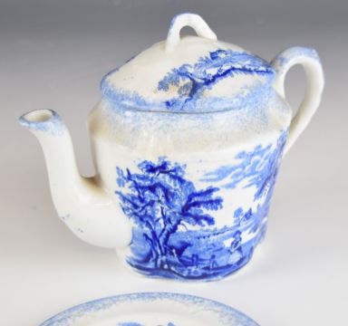 Collection of 19thC blue and white transfer printed ceramics including pair of Ridgways covered tureens with underplates, Spode Net pattern, Dickens pattern tea ware, Spode Woodman saucers, Davenport, Rogers, View of London, Belvoir Castle, footed creamware jelly mould, etc