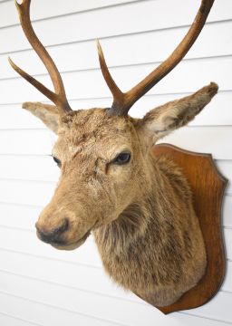 Taxidermy red deer stag on an oak shield mount, approximate height 118cm