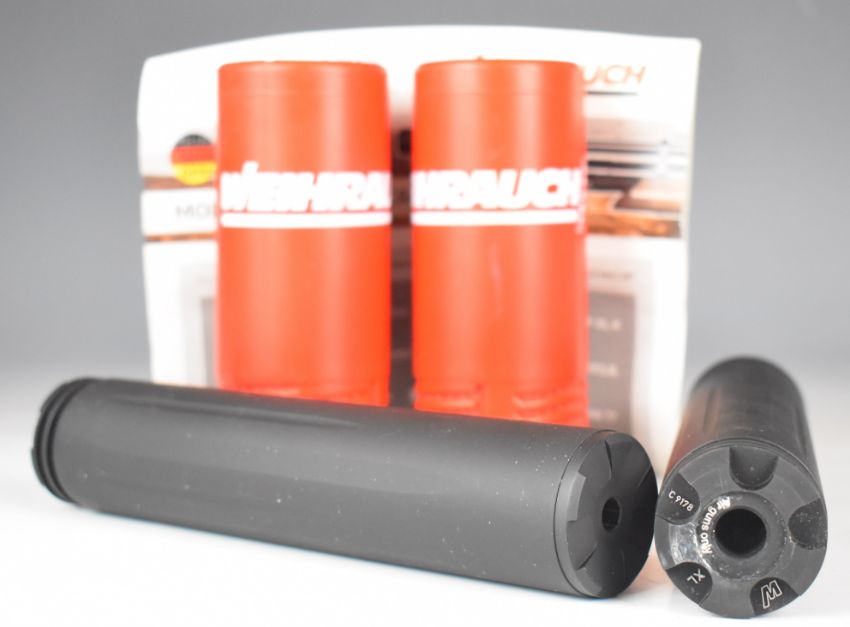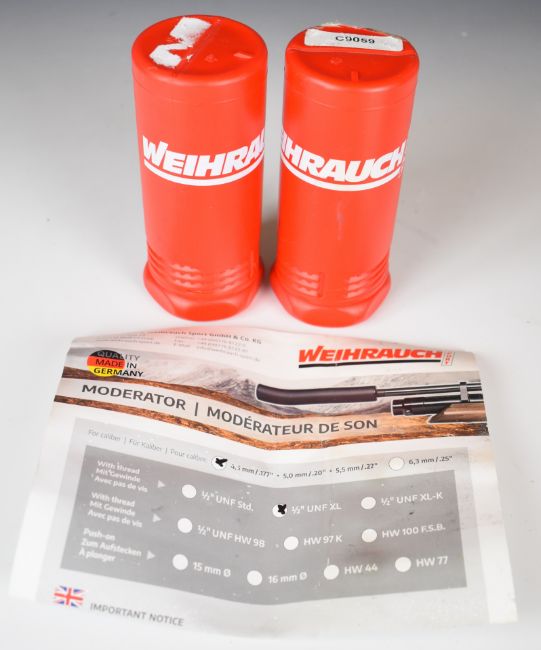 Two Weihrauch HW XL air rifle sound moderators, both in original tubes, one with instructions.