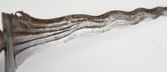 Malaysian Kris dagger with wooden grip, wavy edged 32cm blade and scabbard, together with a modern dagger with decorated grip and sheath, stamped India to 14cm single edged blade. PLEASE NOTE ALL BLADED ITEMS ARE SUBJECT TO OVER 18 CHECK ON COLLECTION OR DELIVERY