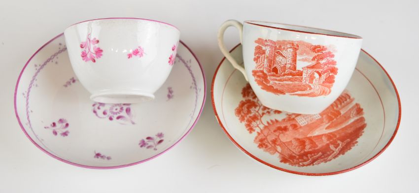 18th / 19thC tea ware including Barr, Worcester, Coalport, Yates interior decorated cup and saucer, bat printed tea bowl and saucer with puce decoration of sheep and cattle, pearlware cup and saucer and twin handled pierced basket with applied flowers and faint mark to base, probably Worcester
