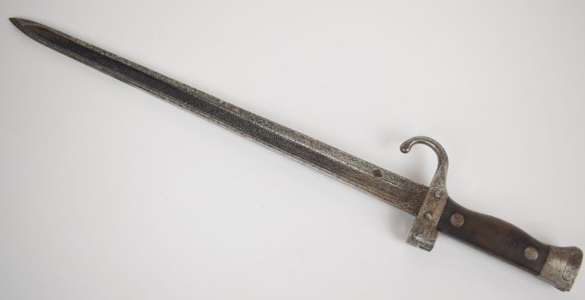 French 1892 Mannlicher Berthier bayonet with wooden grips and 39.5cm fullered single edge blade. PLEASE NOTE ALL BLADED ITEMS ARE SUBJECT TO OVER 18 CHECK ON COLLECTION OR DELIVERY