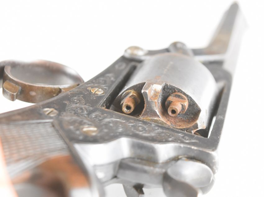 William Tranter's Patent  Model 4 54 bore five-shot double-action revolver with engraved trigger guard, loading lever and butt plate, chequered wooden grip, engraved frame marked 'No 14930 T' and 6 inch rifled octagonal barrel, overall length 33cm