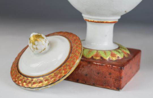 A pair of Chinese covered twin handled pedestal urns with relief moulded swags and landscape cartouches within floral borders, height 35.5cm