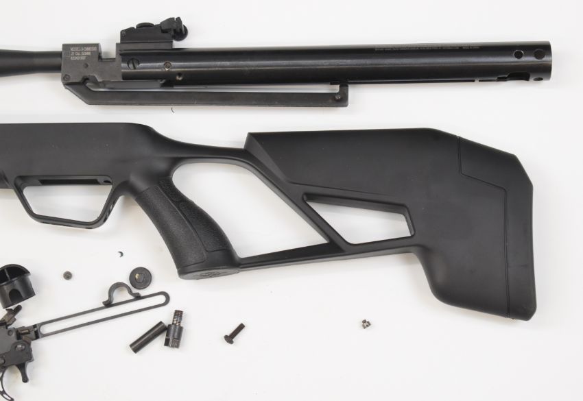 Crosman Mag-Fire Mission Model 6-CMM2SXS .22 air rifle with skeleton composite stock, textured grip, adjustable sights and sound moderated barrel, serial number 823X01597, in original box with instructions and accessories.