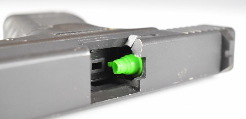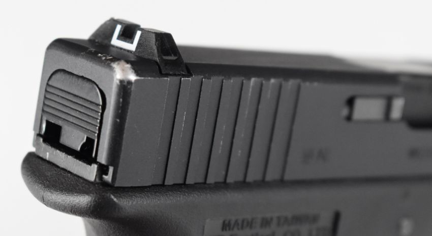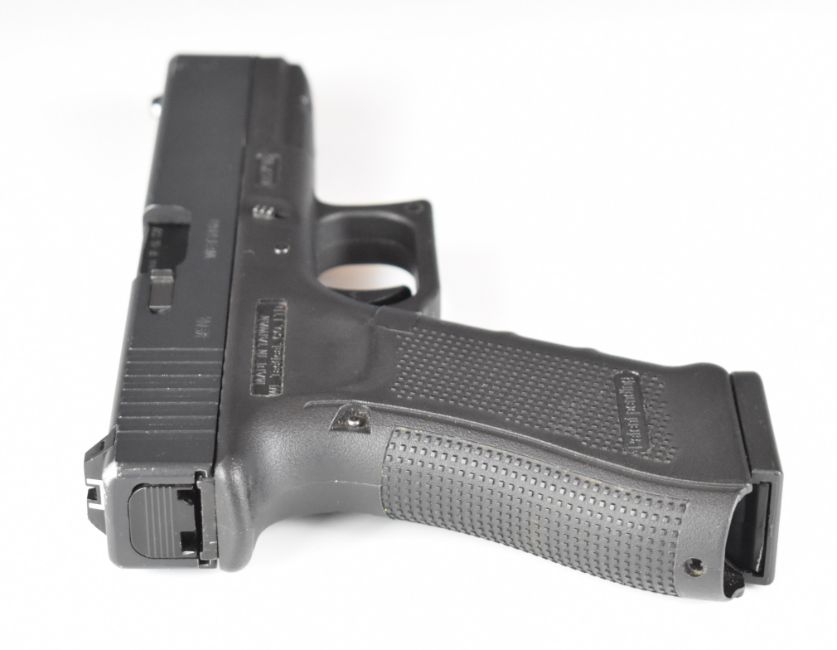 W E Tactical 9x19 airsoft pistol with textured composite grip and fixed sights, serial number WET5168, in Nuprol carry case.