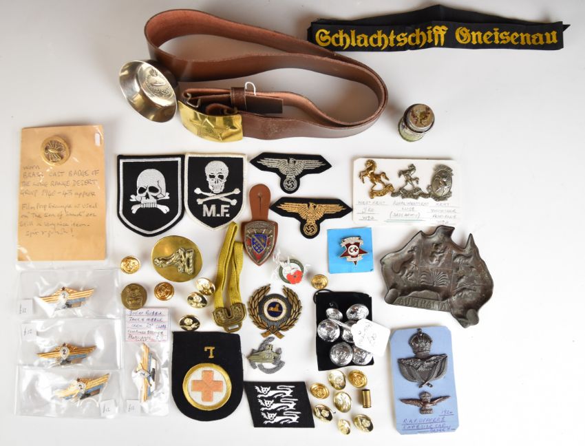 German WW2 and reproduction items including RAF cap badge, belt etc
