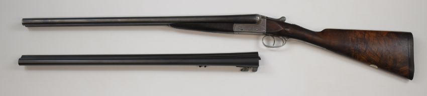 Alex Martin XXV 12 bore side by side ejector shotgun with named and engraved lock, scrolling engraving to the trigger guard, underside, thumb lever, fences and top plate, chequered grip, carved teardrop to the wrist, double trigger and two sets of 25 inch barrels, one new pair gold named and engraved 'New barrels fitted by Churchill Gun Makers Ltd, Orange Street Gunworks, Leicester Square London' and choked ¼ and ½, the original pair named Alex Martin and unchoked, overall length 105.5cm, length of pull 37cm, serial number 2232. PLEASE NOTE THAT A VALID RELEVANT FIREARMS/SHOTGUN CERTIFICATE IS REQUIRED TO HANDLE/PURCHASE THIS ITEM.