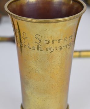 Small collection of trench art / brass ware including coal scuttle from a shell dated 1914 with shovel, vase, card / photo holder, pair of jugs, inkwell, figure of a RAF personnel and dish with motto 'Duty Nobly Done', together with a small brass cannon, letter opener etc