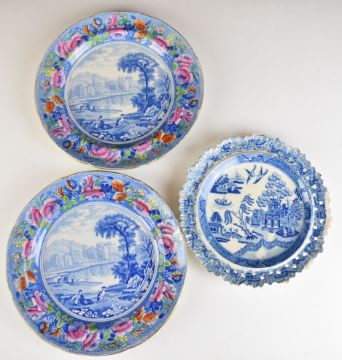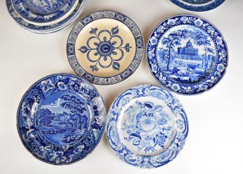 Collection of 19thC mainly blue and white transfer ware by Spode, Rogers, Davenport, Godwin, Ridgway, Copeland etc, scenes include Bridges of London, Belvoir Castle, Persian Cross, Boston State House, Christchurch Oxford, Linlithgow Palace, British scenery, Indian scene, nursery plate, etc