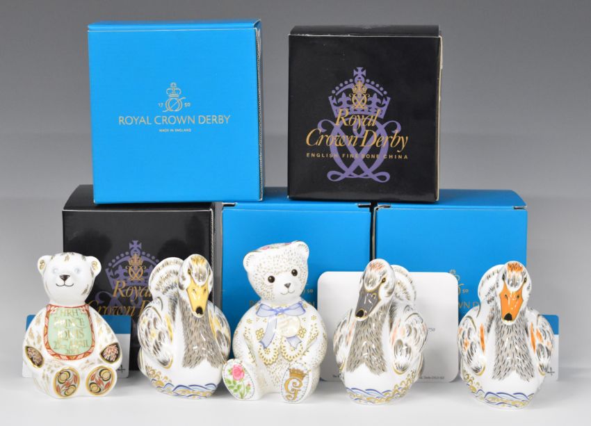 Five Royal Crown Derby Royalty related paperweights comprising Royal Cygnets, George, Charlotte, Louis, Prince Louis Teddy Bear and George Christening Teddy, all boxed with certificates, tallest 11cm