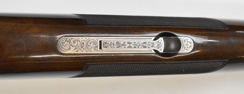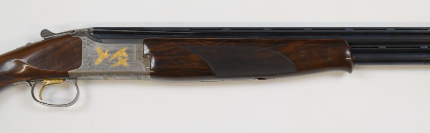 Browning B525 Ultimate 12 bore over and under ejector shotgun with gold engraving of birds surrounded by further scrolling engraving to the locks and underside, engraved trigger guard, top plate and thumb lever, chequered semi-pistol grip and forend, adjustable single trigger, vented top rib and 30 inch multi-choke barrels, overall length 120.5cm, length of pull 37.5cm, serial number 39578MW, in original case with two additional chokes and choke key. PLEASE NOTE THAT A VALID RELEVANT FIREARMS/SHOTGUN CERTIFICATE IS REQUIRED TO HANDLE/PURCHASE THIS ITEM.