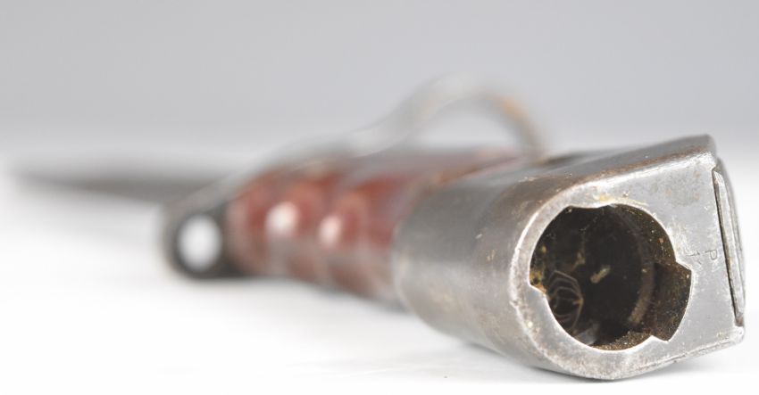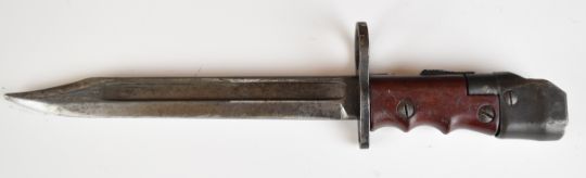 British knife bayonet number 7 with swivel pommel, 1948 to ricasso, 20cm fullered blade and scabbard. PLEASE NOTE ALL BLADED ITEMS ARE SUBJECT TO OVER 18 CHECK ON COLLECTION OR DELIVERY