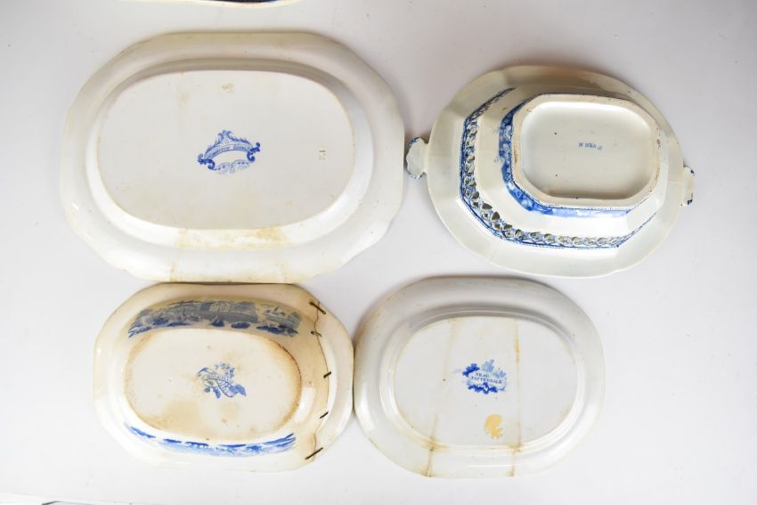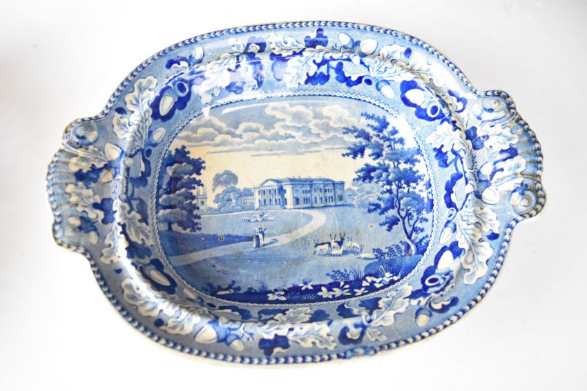 19thC blue and white transfer printed dishes and platters with named scenes including Leighton Buzzard Cross to a twin handled pierced dish, Holkham Hall near Patterdale, Chepstow Castle, Hare Hall Yorkshire etc, largest 29 x 37cm